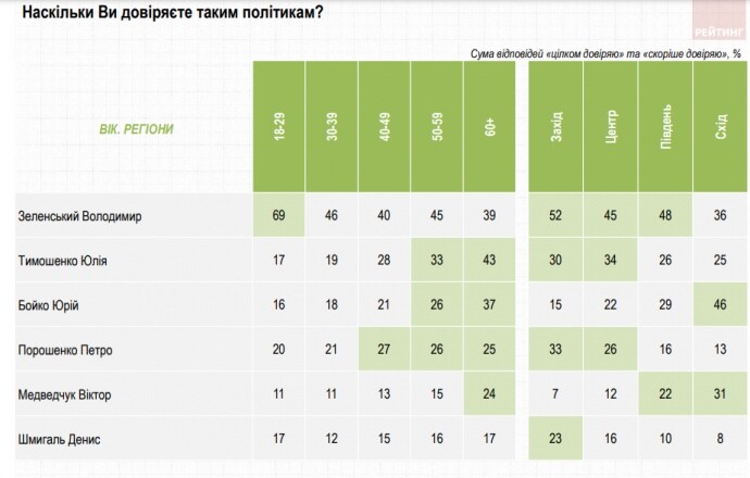 Рейтинг довіри до політиків очолюють президент Володимир Зеленський і лідерка “Батьківщини” Юлія Тимошенко.