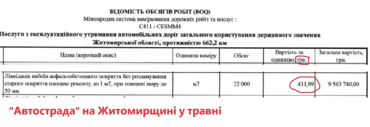 Різниця між житоминським і вінницьким прайсом на цю послугу становить 752 гривні за квадратний метр. Якщо «Автострада» отримає повне замовлення на цю послугу, то за три роки Вінницька служба заплатить фірмі по всім трьом контрактам за неї 768 млн грн. А якби ця послуга оплачувалась по житомирському прайсу, то заплатили б лише 281 млн грн. Тобто потенційна переплата становить 487 млн грн лише на латанні асфальтного покриття товщиною до 5 сантиметрів при розмірі вибоїни до 1 квадратного метра. А це лише одна з кількох сотень позицій у контрактах на експлуатаційне утримання доріг Вінницької області на 10,5 млрд грн.
