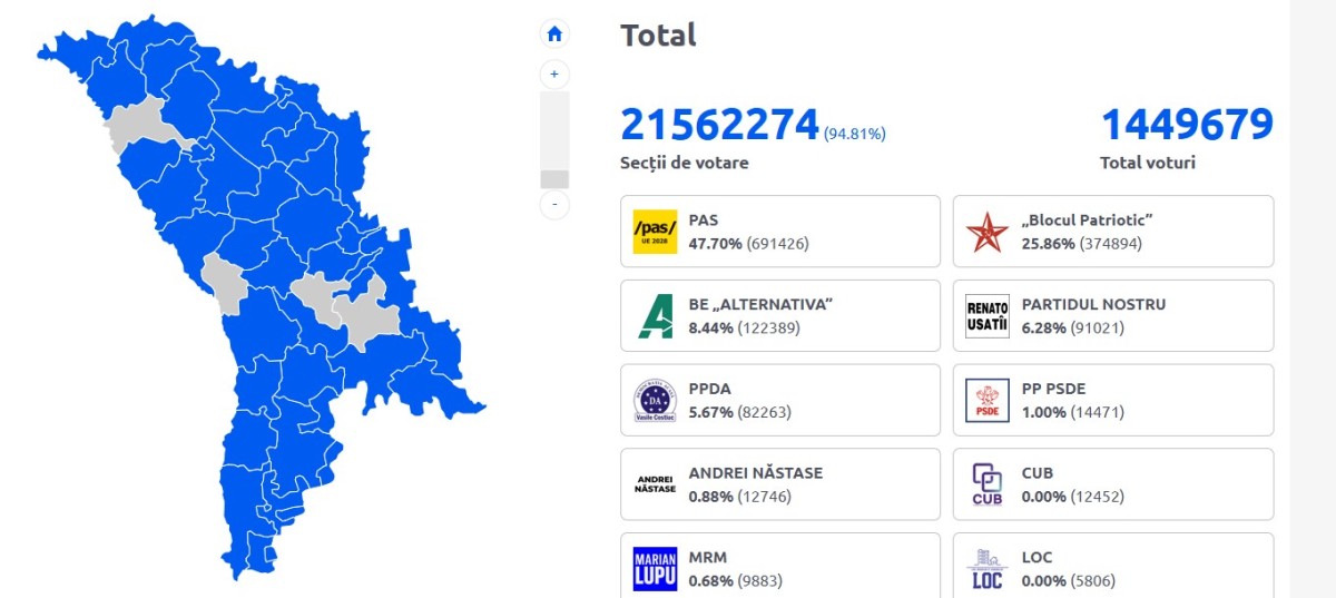 Наразі після підрахунку близько 95% протоколів з дільниць для голосування, партія “Дія і солідарність” (Partidul Acțiune și Solidaritate, PAS) має підтримку більше 47,5% виборців, і цей показник продовжує зростати. Зараз триває підрахунок голосів діаспори, яка голосувала довше, ніж мешканці Молдови. Серед громадян Молдови у європейських державах, які ходять на вибори, є переконлива більшість виборців PAS.
