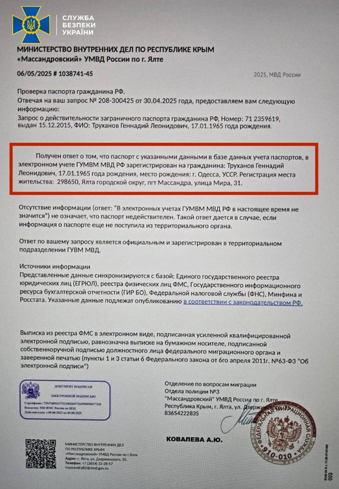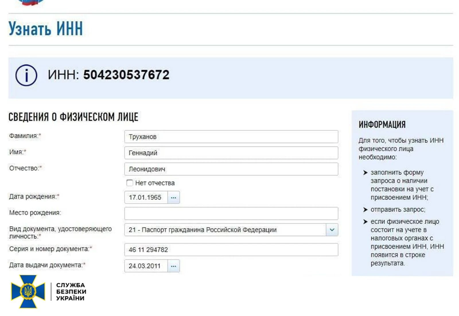 Що стосується внутрішнього паспорту Росії, то за наявною СБУ інформацією, у 2017 році представники Труханова звернулися із заявою до російських уповноважених органів та у підсумку суд у Московській області скасував чинність його внутрішнього паспорту.