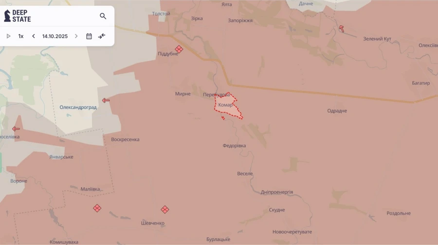 Увечері 14 жовтня DeepState повідомляв, що “ворог зайняв виступ в районі Мирного, Перебудови та Комара”.