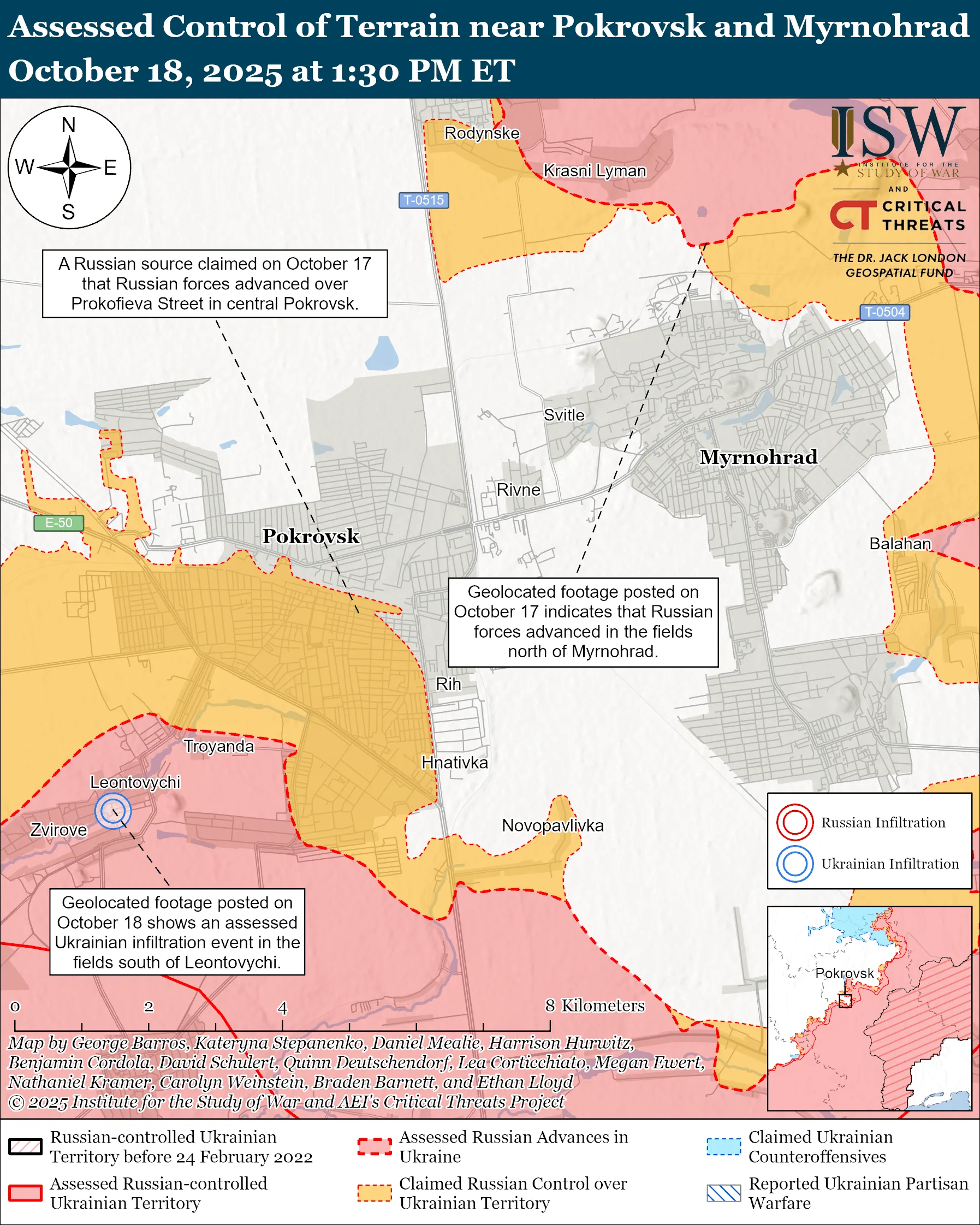 Натомість тут кажуть, що на геолокаційних відеозаписах, опублікованих 18 жовтня, видно, як українські війська атакують російські позиції на південь від села Леонтовичі, розташованого за п′ять кілометрів на південь від Покровська. Американські дослідники війни вважають, що тут ЗСУ працюють по росіянам, що просочилися до цієї місцевості (інфільтрація), і наразі не йдеться про додаткове пересування лінії фронту в бік Покровська.