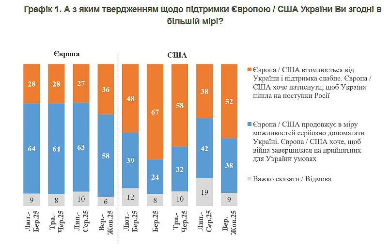 Якщо говорити про США, то частка тих, хто вважає, що США втомилися і тиснуть на Україну для схвалення несправедливого миру цьому зросла з 38% (на початку серпня) до 52% (у жовтні). Частка оптимістів, які прихильно оцінюють політику Америки, знизилася несуттєво (з 42% на початку серпня до 38%).