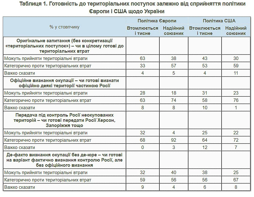 КМІС з’ясував, що ті, хто вважають, що Європа/США втомлюються і тиснуть на Україну, у більшій мірі готові прийняти територіальні втрати, причому навіть найважчі.