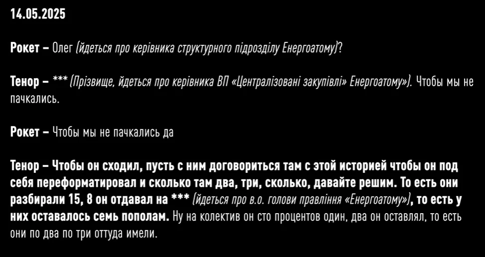 У плівках фігурують люди з позивними “Рокет”, “Тенор” і “Карлсон”. Вони обговорюють будівництво об’єктів в енергетичній сфері, розподіл “відкатів” і можливі кадрові зміни в Міненерго та “Енергоатомі”.