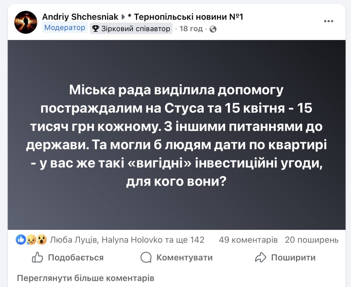 Під дописом редактора Politerno Андрія Щесняка в найбільший Фейсбук-групі Тернополя “Тернопільські новини №1” щодо мізерної суми підтримки з боку ТМР людей, які втратили усе своє майно, тернополяни висловлюють неабияке обурення.