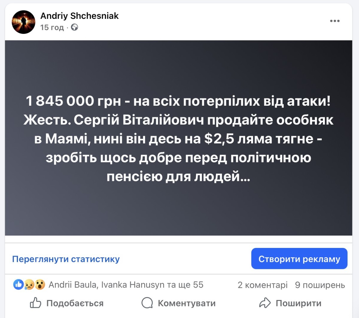 1 845 000 грн – на всіх потерпілих від атаки! Жесть. Сергій Віталійович продайте особняк в Маямі, нині він десь на $2,5 ляма тягне – зробіть щось добре перед політичною пенсією для людей…