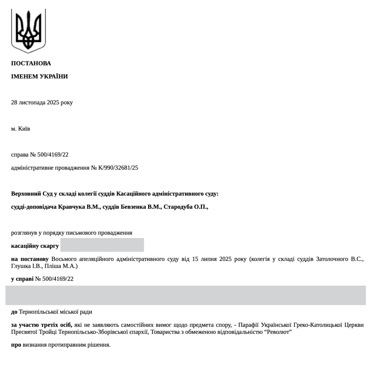 28 листопада 2025 року Верховний Суд скасував Постанову Восьмого апеляційного адміністративного суду від 15 липня 2025 року у справі №500/4169/22 та залишив в силі рішення Тернопільського окружного адміністративного суду від 7 травня 2025 року, яким визнано протиправним та скасовано пункт 4 рішення Тернопільської міської ради від 29.01.2021 № 8/3/78 щодо затвердження проекту землеустрою щодо відведення земельної ділянки на Малишка-Чайковського релігійній організації “Тернопільсько – Зборівській архиєпархії Української Греко – Католицької Церкви”. Це не перше рішення ВСУ щодо незаконного будівництва на церковній ділянці.