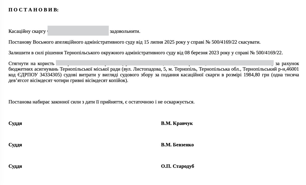 Зокрема, як повідомляло наше видання, 7 лютого 2025 року Верховний Суд України постановив скасувати рішення, як першої, так і другої інстанцій, а саме – Тернопільського окружного адміністративного суду від 8 березня 2023 року та постанову Восьмого апеляційного адміністративного суду від 6 лютого 2024 року у справі №500/4169/22. Справу направлено на новий судовий розгляд до суду першої інстанції.