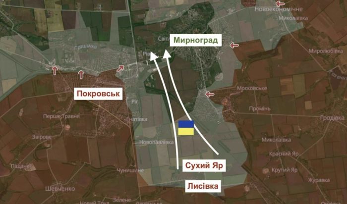 Сили оборони кілька тижнів тому відійшли з частини позицій під Покровськом і Мирноградом, зокрема в районі сіл Сухий Яр та Лисівка. Таким чином “мішок” напівоточення зменшився.