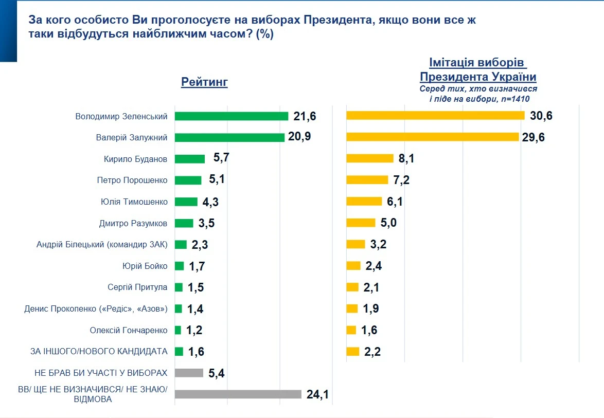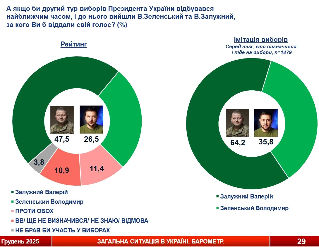 Якщо б президентські вибори відбулися найближчим часом і у них брали участь нинішній посол України в Британії генерал Валерій Залужний і президент Володимир Зеленський, то вони обидва пройшли б у другий тур.