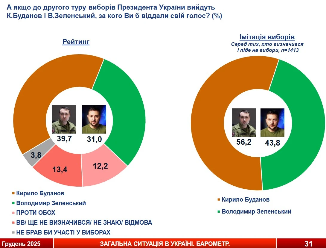 У другому турі впевнену перевагу зберігає Залужний з результатом 64% проти 36% у Зеленського. Якщо Залужний не братиме участь у президентських виборах, то на другий тур ймовірно разом з Зеленським попаде керівник ГУР Кирило Буданов. В такому випадку переміг би Буданов (56%) проти 44% у Зеленського.