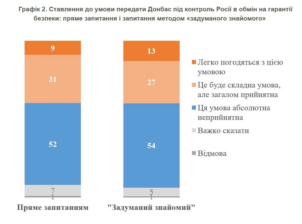 Згідно з дослідженням, 52% респондентів особисто вважають категорично неприйнятним передати під контроль Росії весь Донбас в обмін на гарантії безпеки. Водночас готові на таку поступку – 40% (хоча з них більшість визнають, що це є складною умовою). Ще 7% не змогли визначитися із своєю думкою.