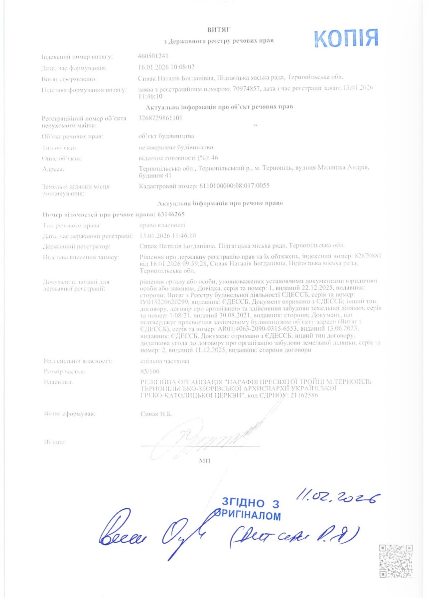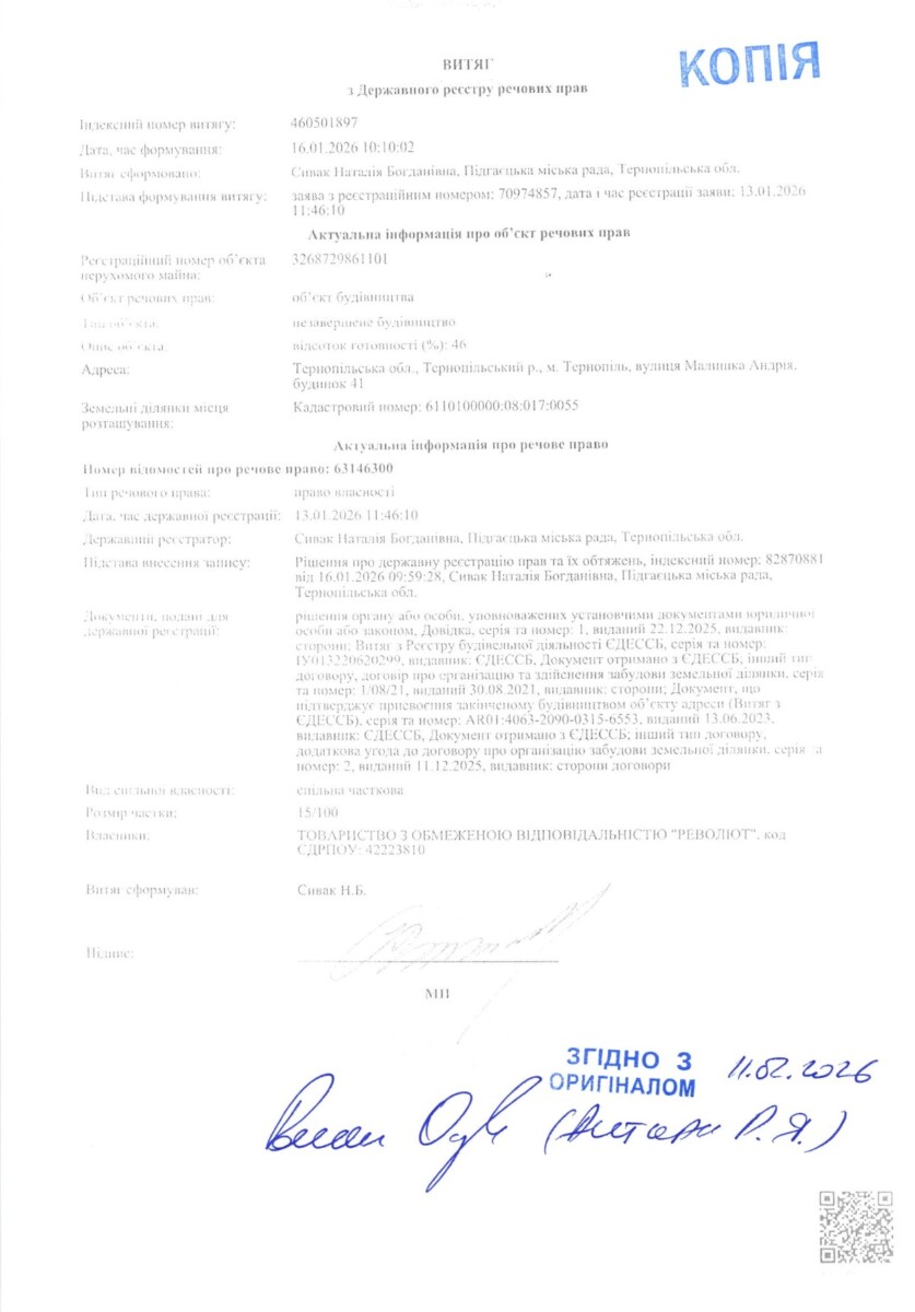 А далі ще цікавіше. В клопотанні забудовників зазначається, що згідно з витягом з ДРРП Nº460501897 13 січня 2026 року зареєстровано право власності (спільна часткова власність, розмір частки 15/100) на об’єкт незавершеного будівництва, що розташований на земельній ділянці к.н. 6110100000:08:017:0055, за адресою: вул. Андрія Малишка, будинок 41, м. Тернопіль.