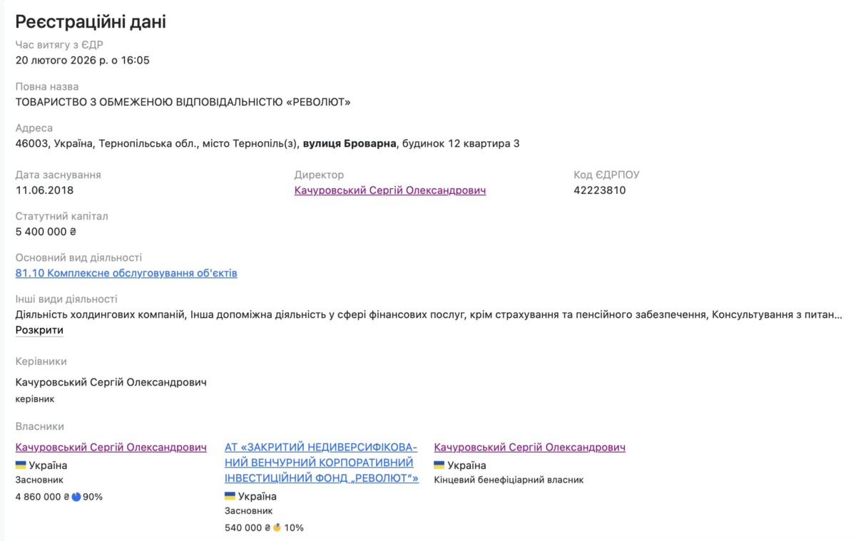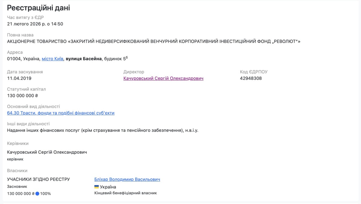АТ «Закритий недиверсифікований венчурний корпоративний інвестиційний фонд „Револют“», якому належить 10% ТОВ «Револют», напряму належить Володимиру Бліхару.