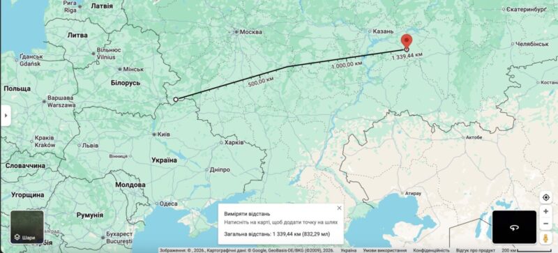 Відстань від кордону України до Альметьєвська приблизно 1300 км.