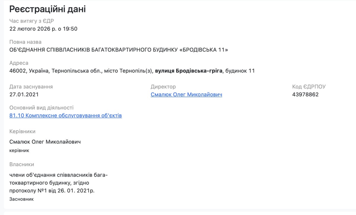 У матеріалах Politerno щодо скандальних будівельних афер на Шпитальній за участі компанії «Проф-Тер-Буд» ми згадували про її власників Олега Смалюка та Сергія Щеглецького. Саме Олег Смалюк придбав одну з трьох квартир на Бродівській, 11, а згодом, після того, як його підлеглі викупили інші дві квартири, очолив згадане ОСББ «Бродівська, 11», якому міська рада віддала 0.0989 га комунальної землі.