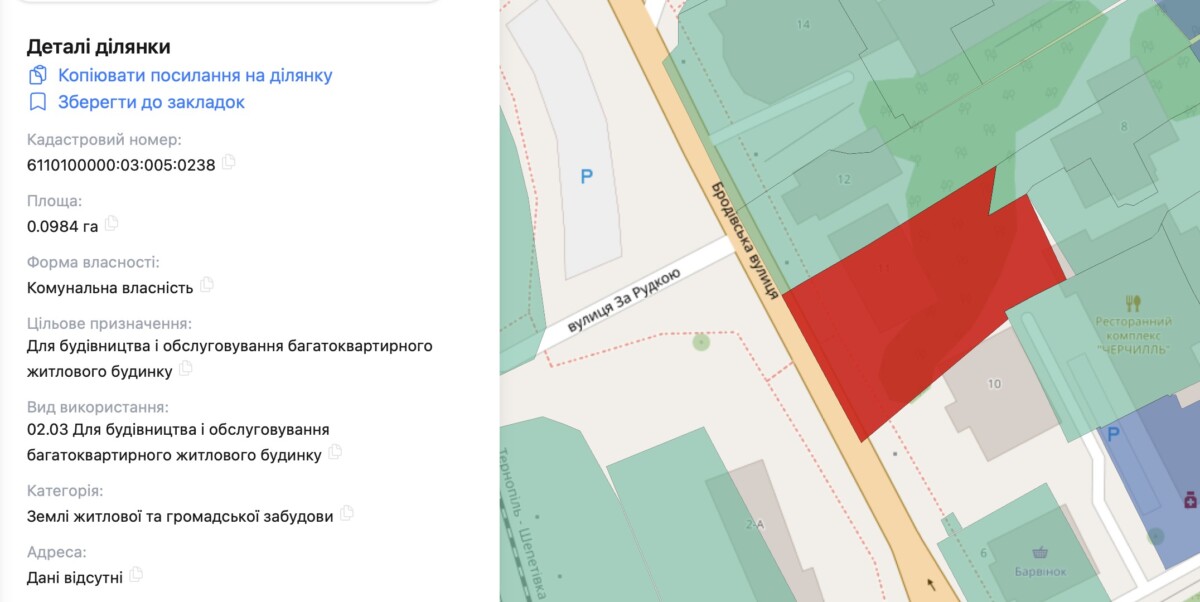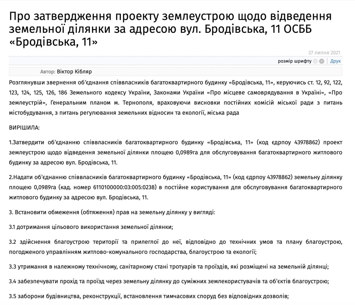 3 вересня 2021 року рішенням №8/9/49 Тернопільська міська рада надала в користування ОСББ «Бродівська, 11» земельну ділянку площею 0.0989 га з кад. ном. 6110100000:03:005:0238 комунальної власності для будівництва і обслуговування багатоквартирного житлового будинку.