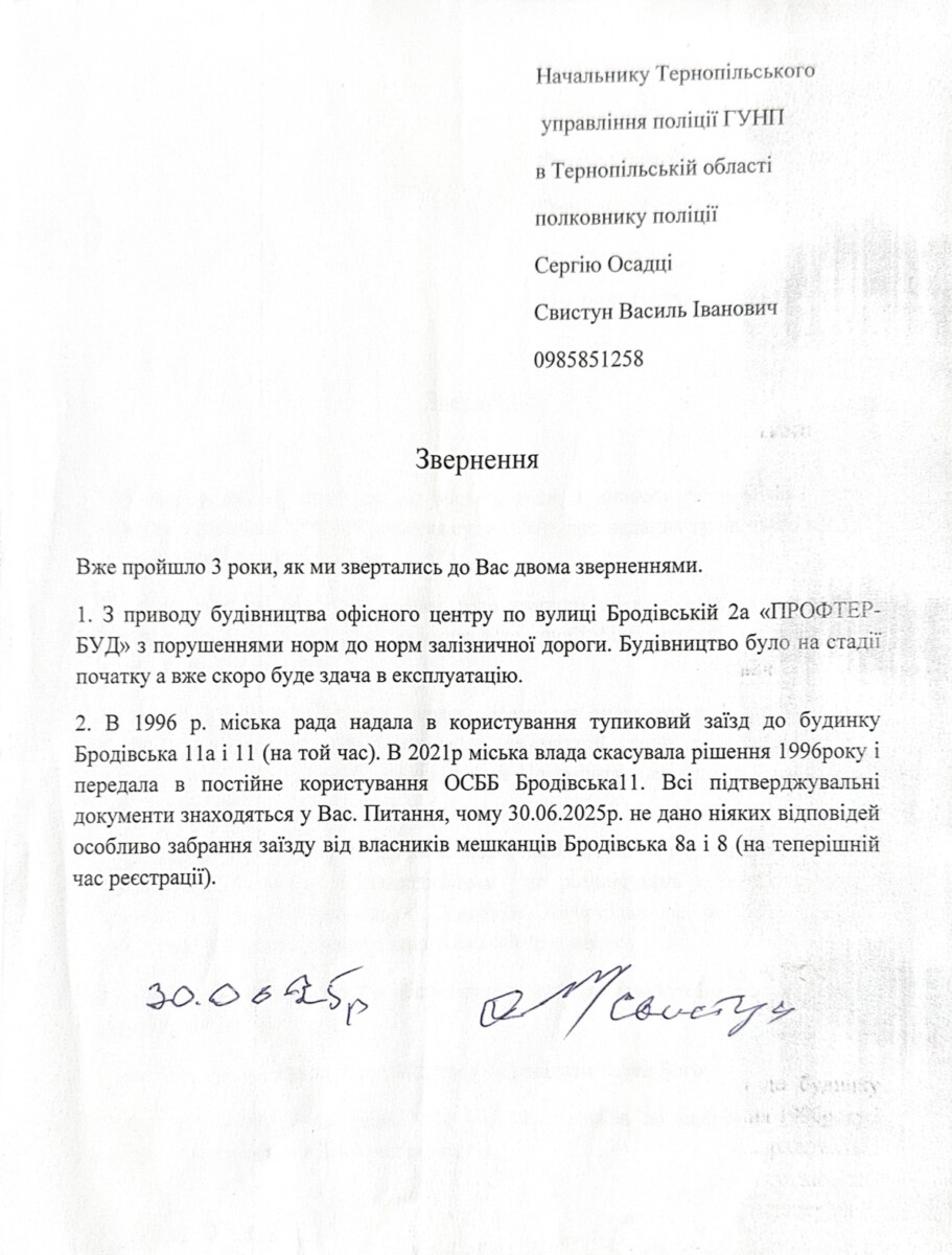 Фігуранти будівельної афери на Шпитальній, 22 та 26 Олег Смалюк та Сергій Щеглецький разом із Тернопільською міською радою позбавили жителів вул. Бродівська 11-а права користуватися заїздом до свого будинку, адже розпочинають будівництво дев’ятиповерхового будинку на суміжній ділянці.
