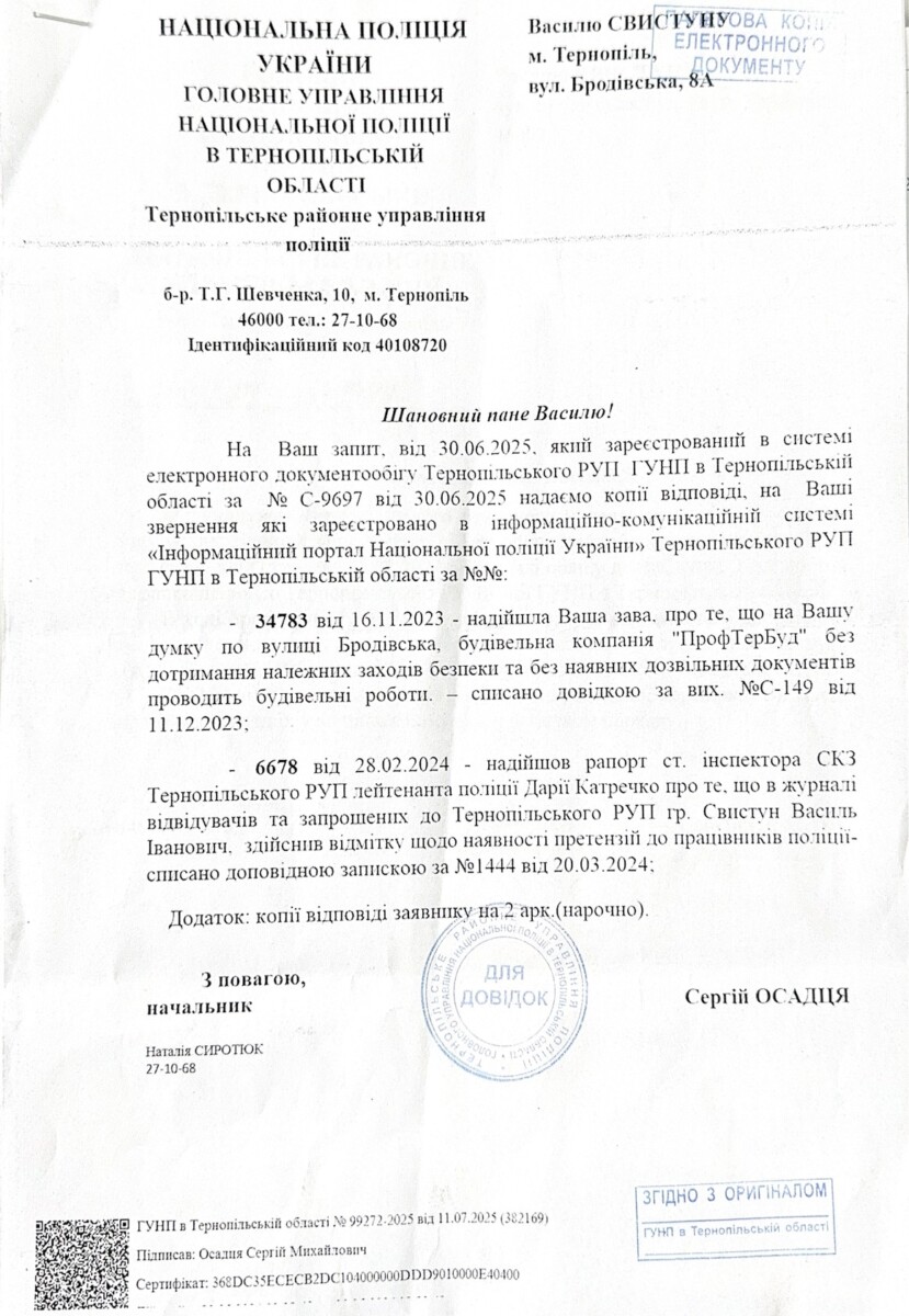 Наводимо копії звернення постраждалого від дій Тернопільської міської ради місцевого жителя Василя Свистуна та відписок Сергія Осадці. Це черговий приклад того, як поліція «грає дурня» з тернополянами: