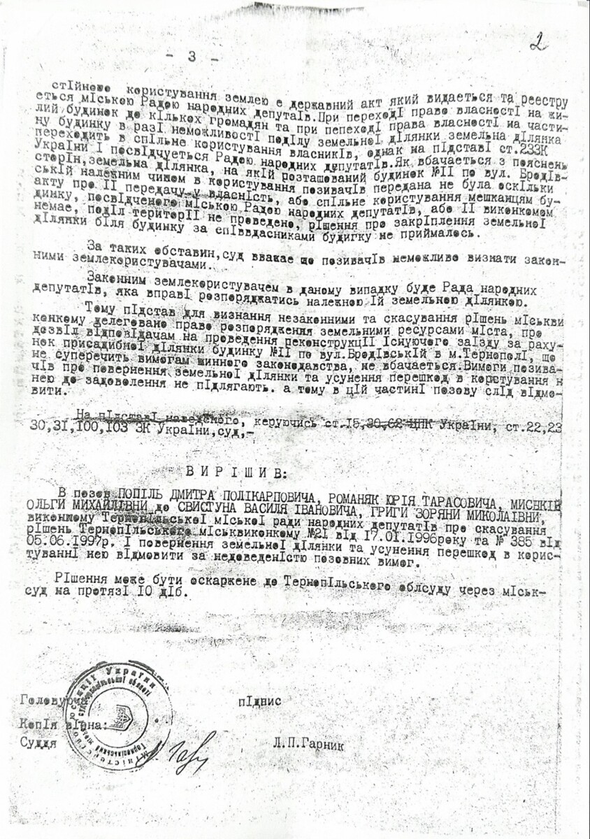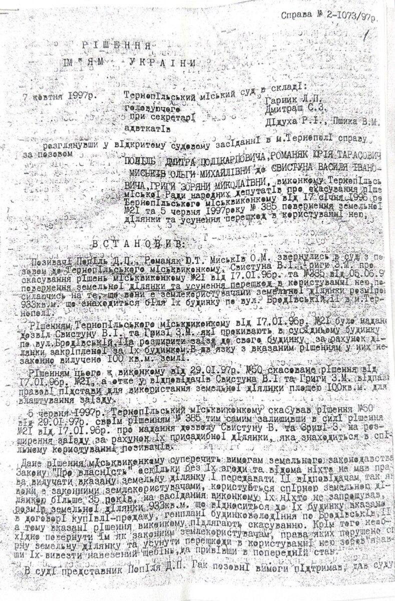 Окрім рішення Тернопільської міської ради від 1996 року факт правомірності користування заїздом мешканцями Бродівської, 11-а доводить рішення Тернопільського міського суду від 7 квітня 1997 року – тоді сусіди, у яких через десятки років квартири викупили «профтербудівці», вимагали скасувати зазначене рішення міськради, але суд залишив його в силі. Програли позивачі й у Верховному суді.