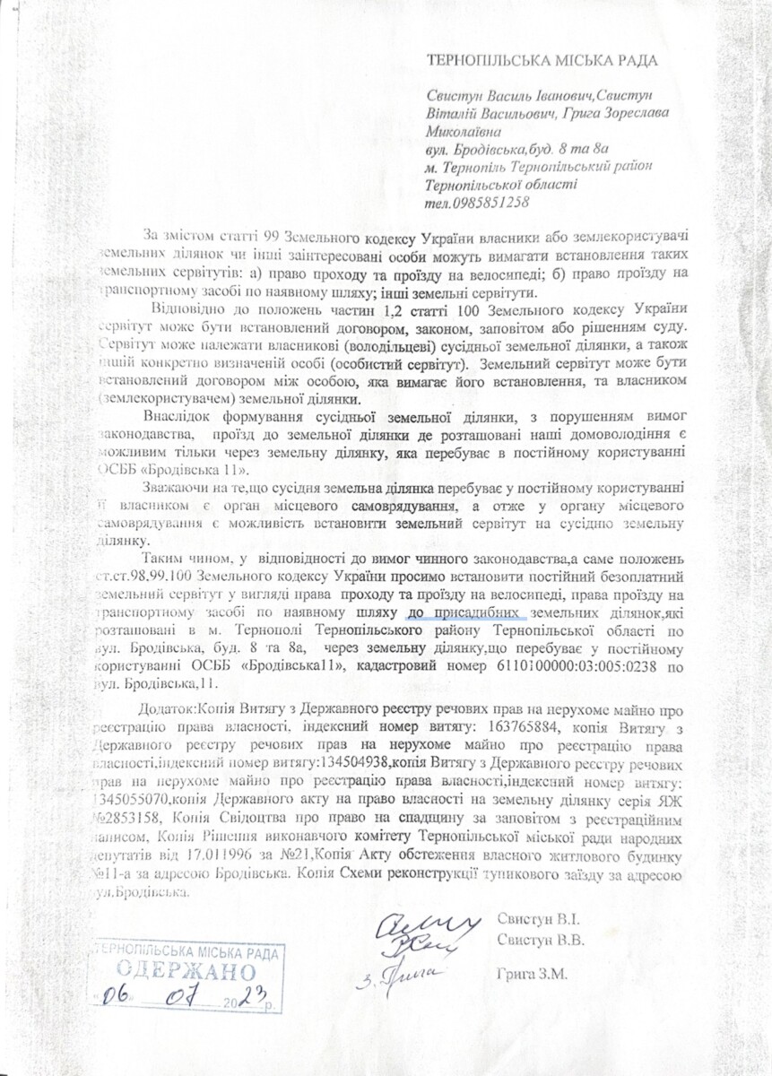 Родини Свистунів та Григ звернулися у Тернопільську міську раду з питанням, чому на території їхнього заїзду прокладали кабель. Там їх ошелешили новиною про вищезгадане рішення міської ради, яким людей позбавили під’їзду до своїх помешкань.