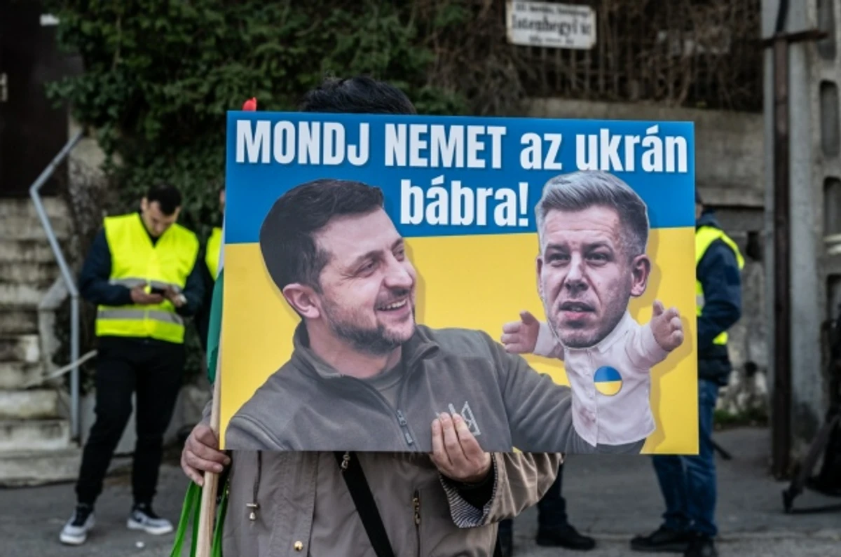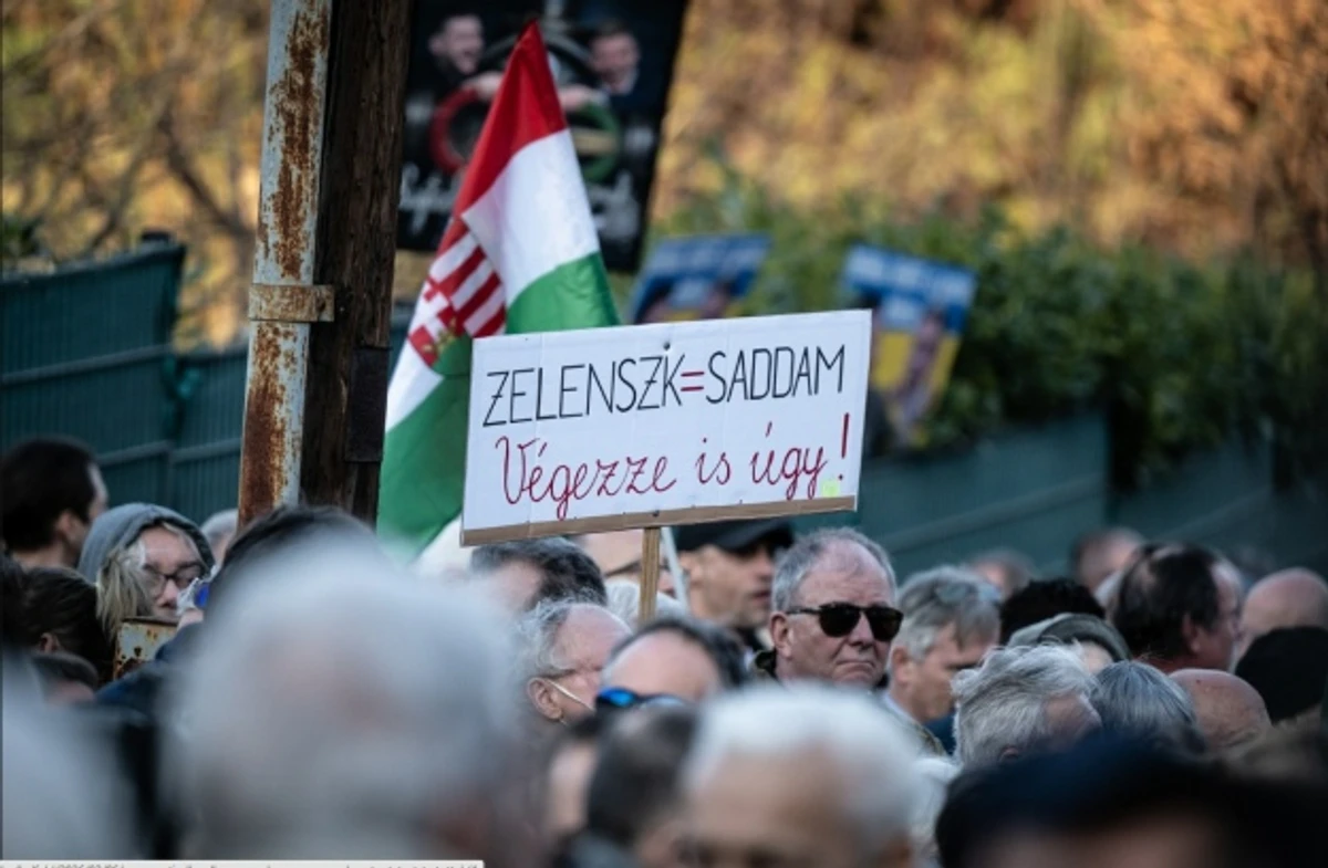 На подію прийшли близько сотні учасників або більше. Можна було бачити плакати, де ключового суперника Орбана на майбутніх виборах, Петера Мадяра, зобразили як “маріонетку Зеленського”, написи “Зеленський = Саддам” тощо.