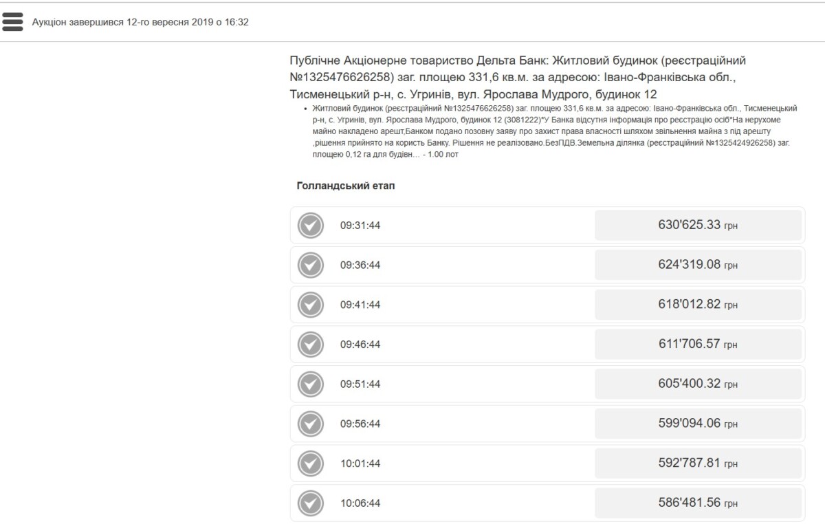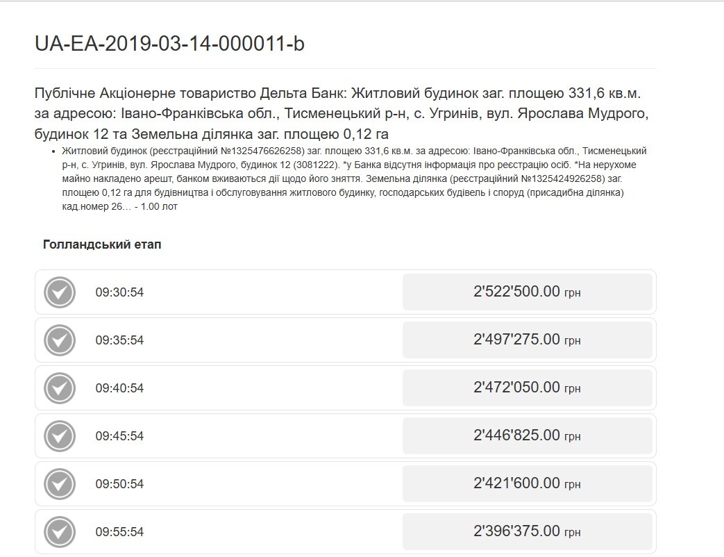 Стартова ціна будинку у квітні 2019 року складала 2 522 500 грн й бажаючих торгуватися на цьому етапі аукціону не виявилося: