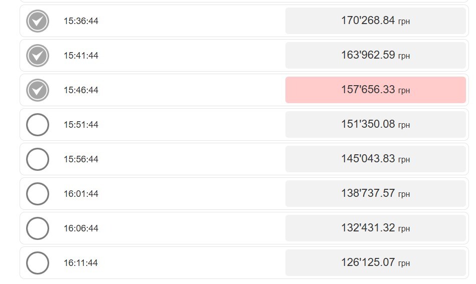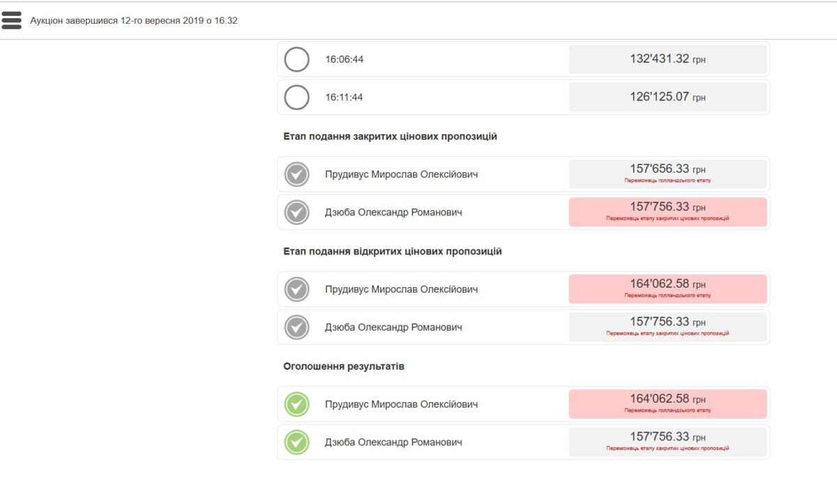 А ось на наступній стадії торгів з’являються два учасники, один з яких, пан Прудивус, зупиняє торги голландського етапу на позначці 157 656.33 грн, після чого він, по суті, стає переможцем, бо отримує право останньої пропозиції у 164 062.58 грн: