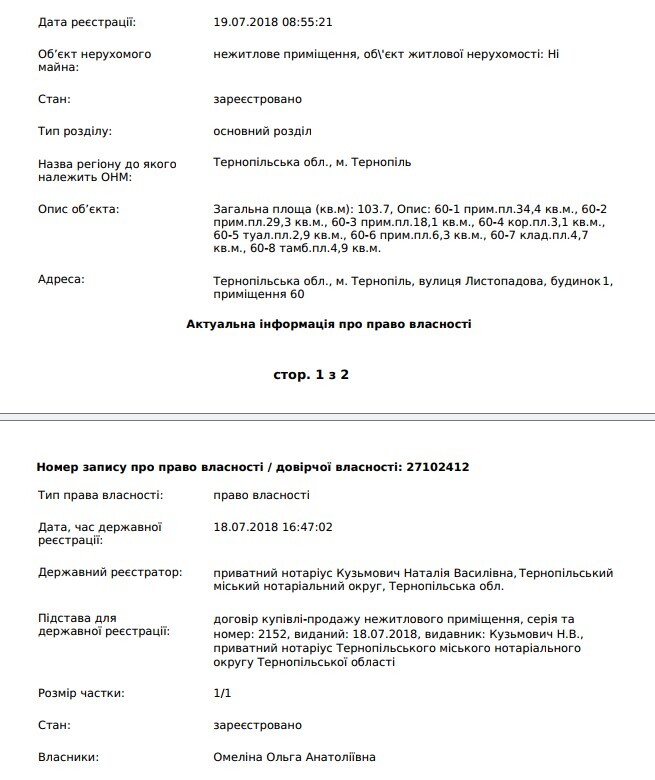 В першу чергу, Ольга Анатоліївна може отримувати дохід від оренди комерційного приміщення №60 площею 103,7 м.кв. в центрі Тернополя на вул. Листопадова, 1, поруч із місцем роботи доньки. За документами, вона придбала цю нерухомість в 2018 році.
