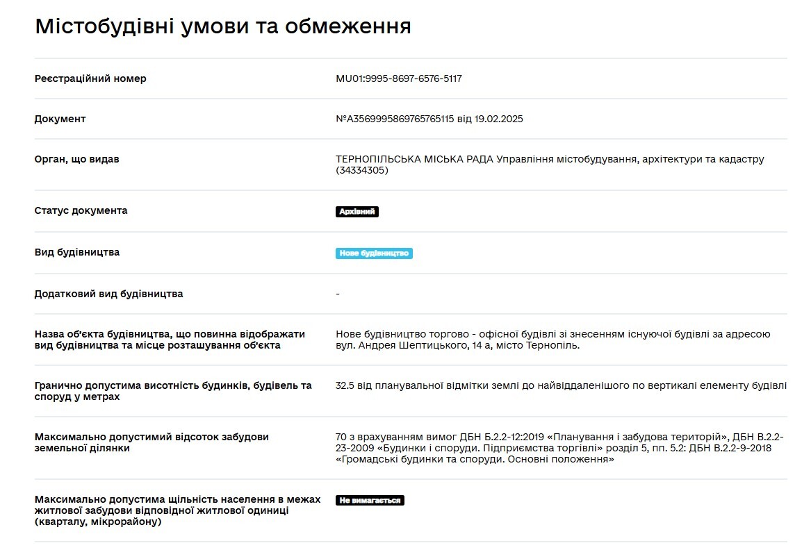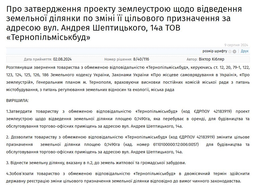 У серпня 2024 року депутати Тернопільської міської ради затвердили ТОВ “Тернопільміськбуд” (код ЄДРПОУ 42183919) проект землеустрою щодо відведення земельної ділянки площею 0,1490 га, яка перебуває в оренді, для будівництва та обслуговування торгово-офісних приміщень за адресою вул. Андрея Шептицького, 14а.