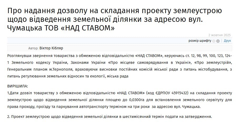 У жовтні 2025 року Тернопільська міська рада надала дозвіл ТОВ «НАД СТАВОМ» (код ЄДРПОУ 45915432) на складання проекту землеустрою щодо відведення земельної ділянки площею до 0,0300 га для встановлення земельного сервітуту для права проходу, проїзду та паркування автотранспорту терміном на три роки за адресою вул. Чумацька.