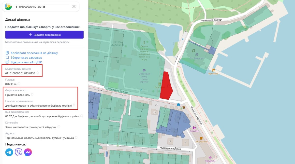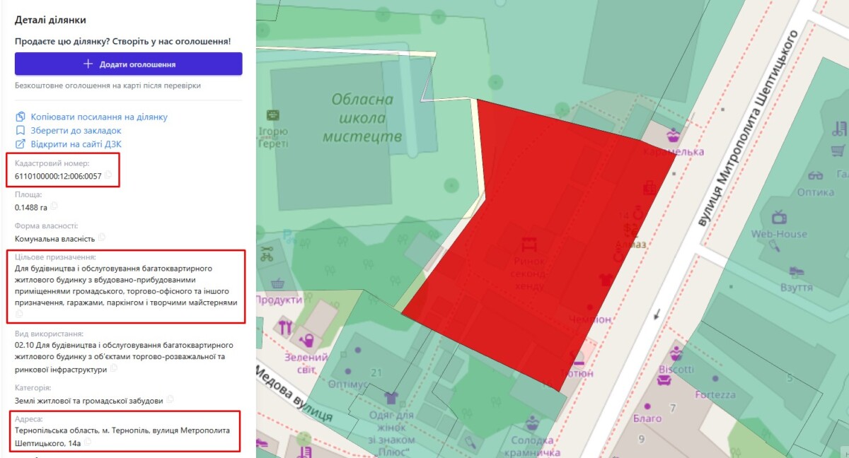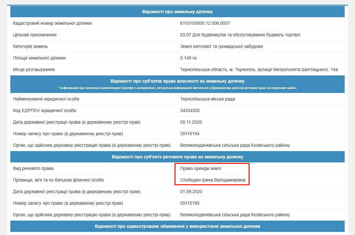 Зокрема, на Ірину Слободян оформлена оренда земельної ділянки з кад. ном. 6110100000:12:006:0057 площею 0,149 га за адресою вул. Андрея Шептицького, 14-А. Тут знаходяться приміщення, які їй, власне, і належать.