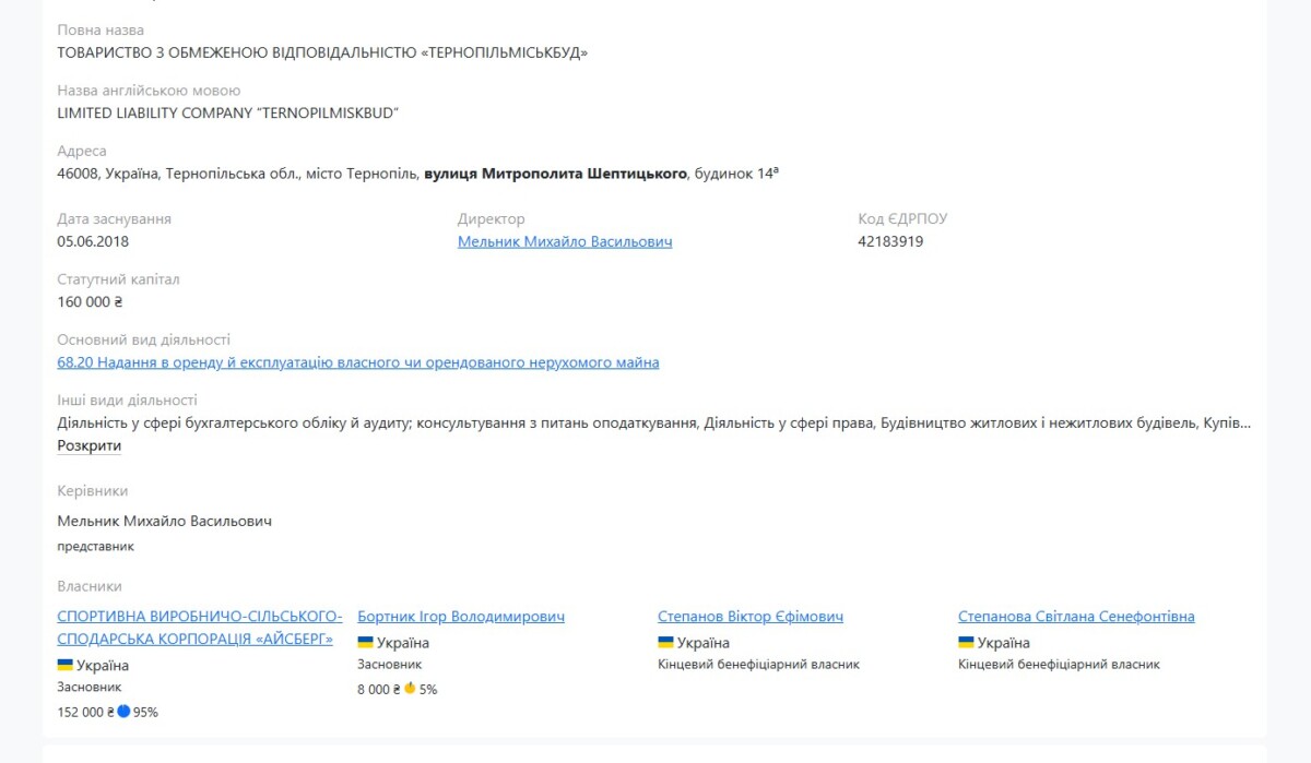 Засновниками ТОВ “Тернопільміськбуд” значаться члени родини та люди з оточення Євгена Степанова – Ігор Бортник та Михайло Мельник.