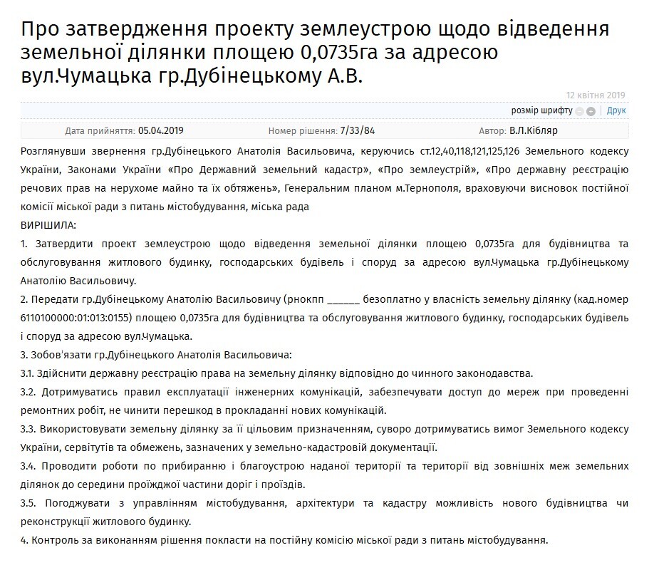 На підставі рішення сесії Тернопільської міської ради №7/33/84 від 5 квітня 2019 року земельну ділянку із кадастровим номером 6110100000:01:013:0155, площею 0,0735 га за адресою вул. Чумацька було надано Анатолію Васильовичу Дубінецькому для будівництва і обслуговування житлового будинку і господарських будівель і споруд.
