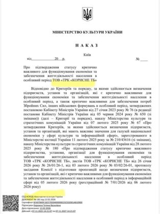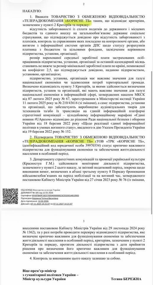 “Цього разу його бронюють як співробітника “Телерадіокомпанії “Корисне ТБ””. Якщо зайдете на їх YouTube канал, то знайдете тільки один контент – поради по саду та городу. Але критичність цьому підприємству МінКульт видав.