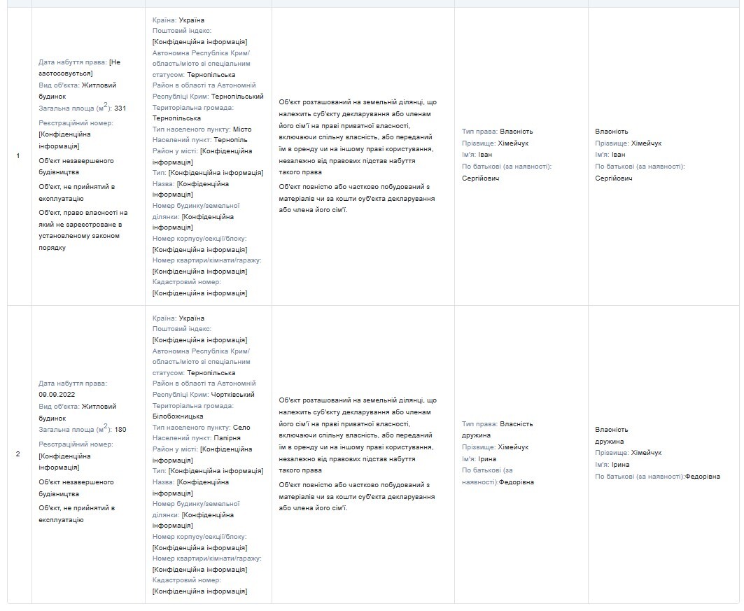 На Ірину Хімейчук записано дві ділянки та будинок у селі Папірня Чортківського району. Також є недобудова в Папірні на 180 кв.м.