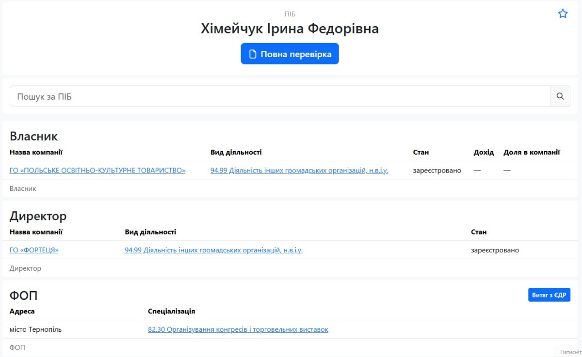 Саме в контексті діяльності сімейної громадської організації ФОП Ірина Хімейчук й зазначила своєю спеціалізацією – “Організування конгресів і торгівельних виставок”.