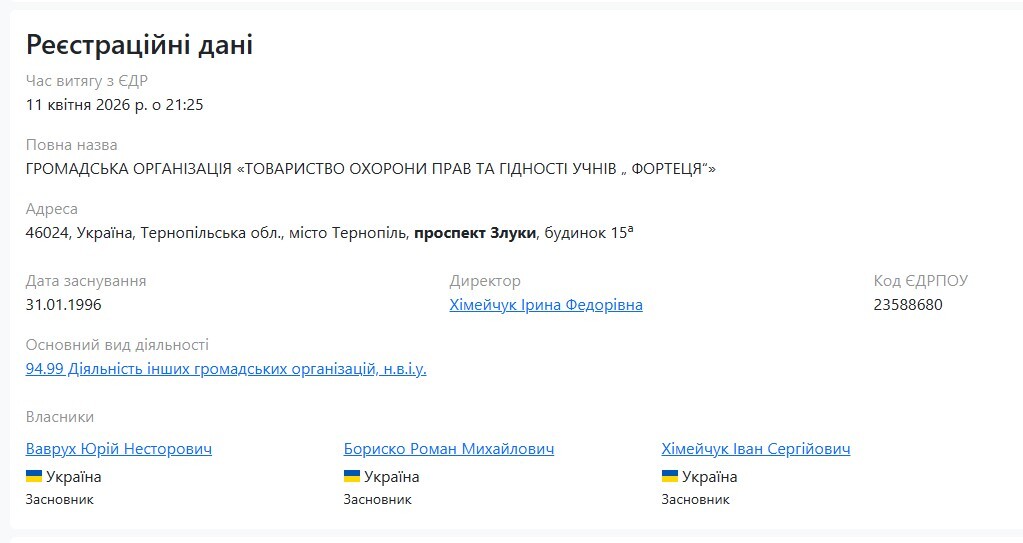 Згадана вище ГО “Товариства охорони прав та гідності учнів “Фортеця”” потрапила в поле зору Politerno минулого року, саме в результаті дослідження декларації Івана Хімейчука. Ми навіть встигли безрезультатно поспілкуватися з Іриною Хімейчук – вона просто не захотіла відповідати на наші запитання. Однак, матеріал допрацювати не вдалося через переслідування редактора Politerno, який завжди виступає головним співавтором, або й одноосібним автором наших журналістських розслідувань.