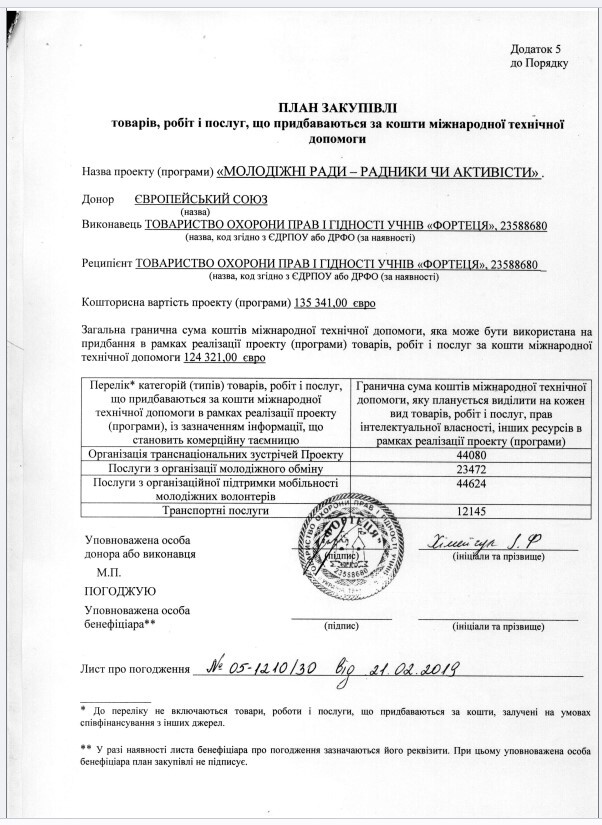 Отримувала організація Хімейчуків й свої чималі гранти. У мережі ми знайшли “План закупівлі товарів, робіт і послуг, що придбаваються за кошти міжнародної технічної допомоги” на 2019 рік. Донором виступив Євросоюз, виконавець ГО “Товариство охорони прав та гідності учнів “Фортеця””, кошторисна вартість проекту – 135 341 Євро.