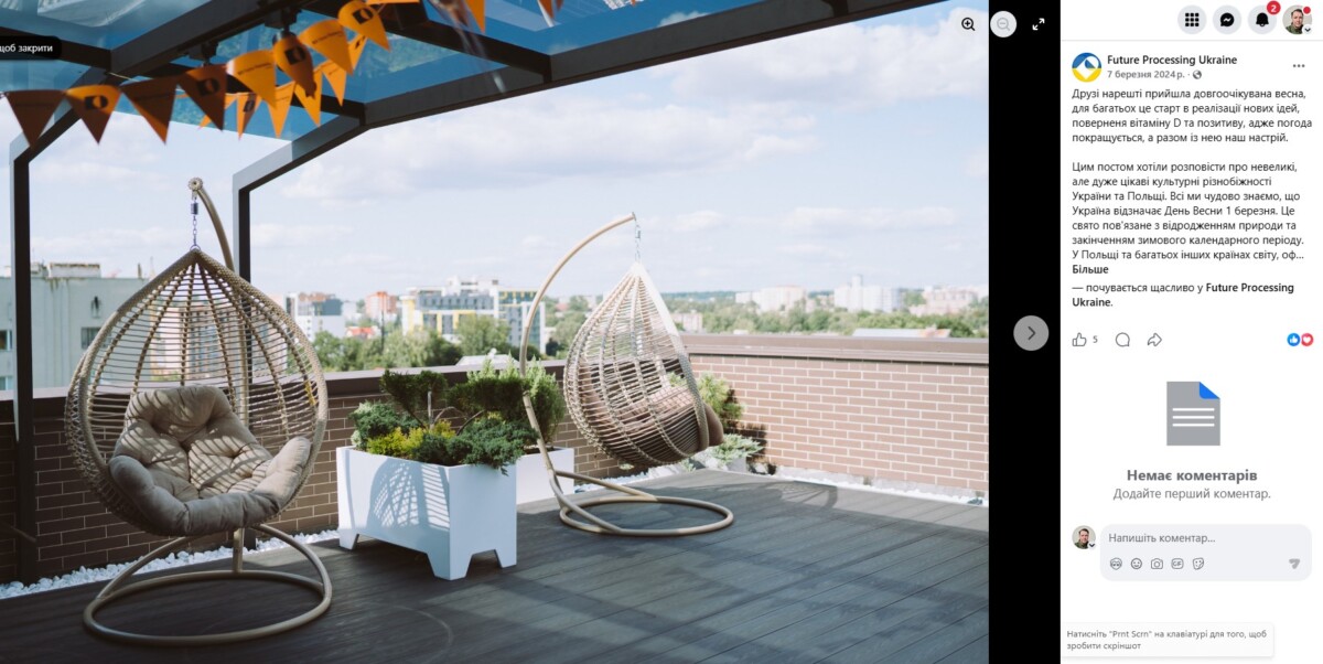 А ось фотографії з Facebook-сторінки Future Processing Ukraine. За вікнами, порівнюючи кадри з історії про “коворкінг”, ми упізнали парк “Сопільче”: