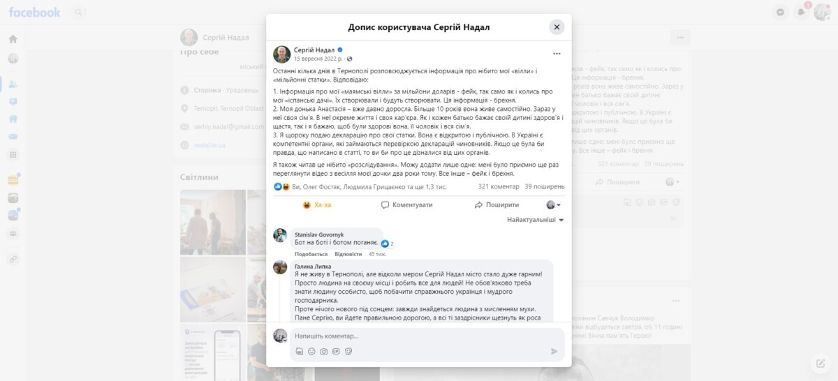 “Останні кілька днів в Тернополі розповсюджується інформація про нібито мої «вілли» і «мільйонні статки». Відповідаю: