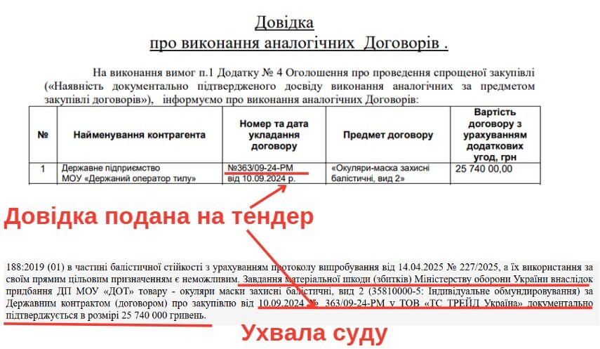 «ТС Трейд Україна» наявність аналогічного досвіду підтвердила контрактом з «Держоператором тилу», який є основою кримінального провадження Головного слідчого управління ДБР. Мова про договір ТОВ «ТС Трейд Україна» та «Державного оператора тилу» на поставку 18 000 балістичних окулярів-масок загальною вартістю 25,74 млн грн (сума визначена, як збиток завданий МОУ).