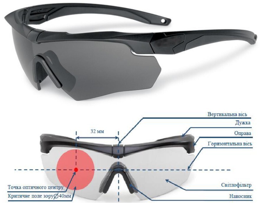 Конструкція окулярів включає комплект із трьох світлофільтрів ‒ прозорий, сонцезахисний і контрастний. Окуляри мають забезпечувати повний захист очей як від ультрафіолетового випромінювання, так і від механічних та балістичних уражень. Світлофільтри мають витримувати влучання уламків зі швидкістю понад 200 м/с та бути стійкими до впливу температур від -5°С до +55°С.