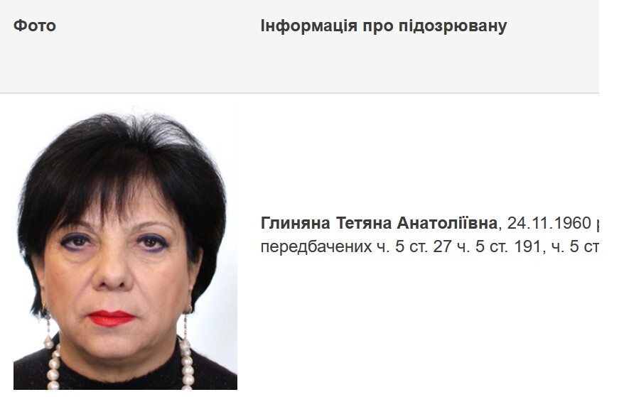 Оголошення про розшук Тетяни Глиняної з сайту НАБУ