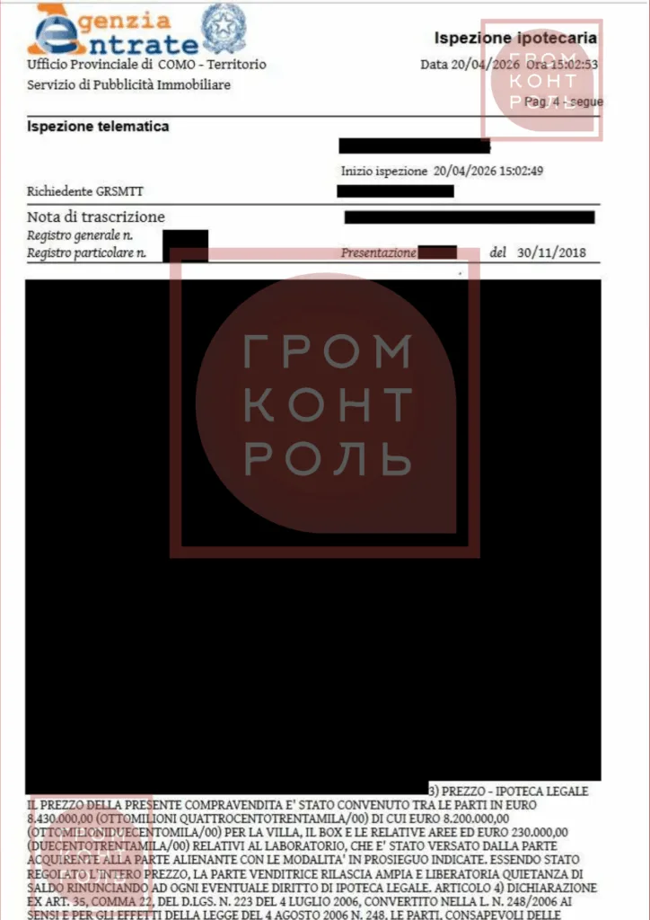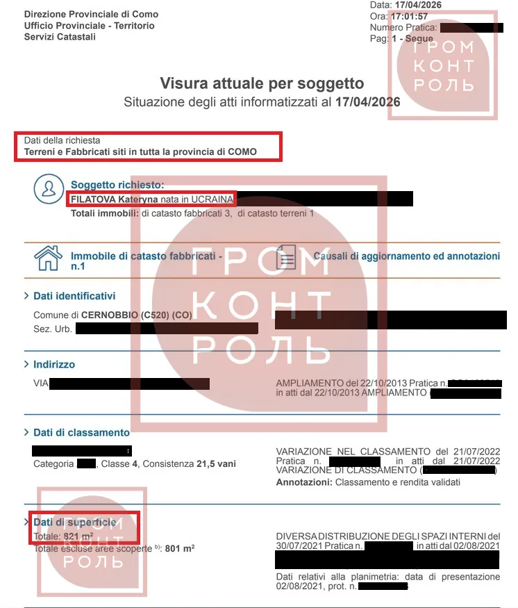 “Згідно з офіційними витягами на Filatova Kateryna на зараз оформлено 3 об’єкти нерухомості та земельна ділянка в містечку Cernobbio (Італія) на озері Комо. Відповідно до документів, місце народження власниці зазначено як Україна, місце проживання — м. Дніпро (Україна)”, – говориться у повідомленні.