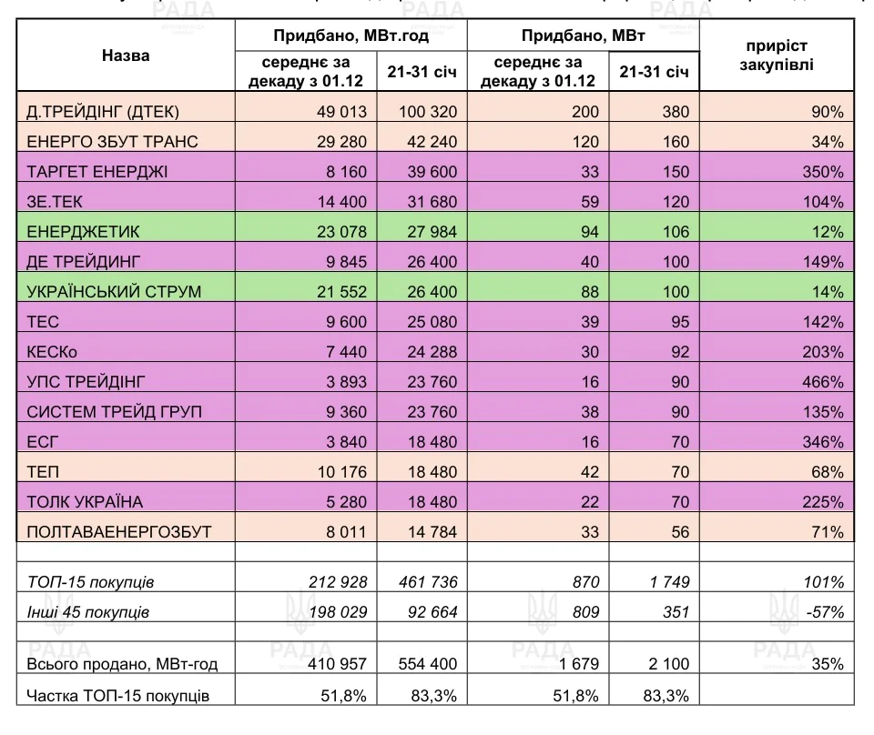 “ТОП-15 компаній збільшили свої закупівлі на 101%, при чому інші 45 компаній зменшили свої закупівлі на 57%. А деякі компанії збільшили обсяги закупівлі аж у 3-4 рази. Така різниця у поведінці свідчить, що деякі великі компанії або заздалегідь знали про можливий перегляд прайс-кепів, або здогадувалися/розуміли, що таке можливо“, — зазначає у своєму листі голова енергетичного комітету ВР.