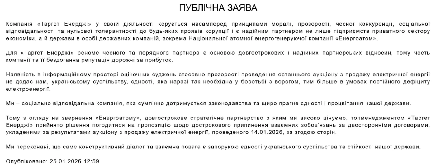 Вже після заяви “Д.Трейдінг” з’явилася явно вимушена реакція “Енергоатому”. Ярослав Железняк опублікував у себе лист державної енергокомпанії до трейдерів, де вона “звертається із пропозицією” про розірвання на добровільній основі договорів, укладених за результатами аукціону 14 січня.