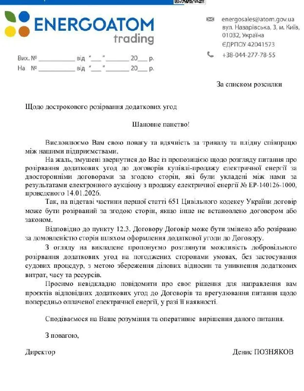 Лист “Енергоатому” з пропозицією про розірвання угод