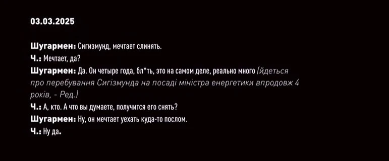До речі, в одному з епізодів, датованому березнем 2025 року Шугармен (Цукерман) говорить про те, що міністр хоче “слинять” і мріє поїхати кудись послом.